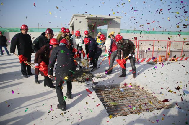 后勤基建处处长党华主持结构封顶仪式,李和章副校长下达封顶指令,宣布前沿交叉科学研究院大楼项目封顶,各参建单位代表挥锹浇筑最后一方混凝土。